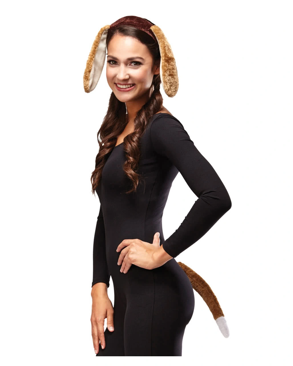 Unser 2-tlg. Hund Verkleidungs-Set beinhaltet einen braunen Haarreifen mit beigen Ohren & einen beige-weißen Schwanz. Der Hundeschwanz ist ca. 25cm lang. Dieses Set sieht besonders klasse aus, wenn du es an Halloween mit dem Schwarzer Catsuit ML kombinierst.
