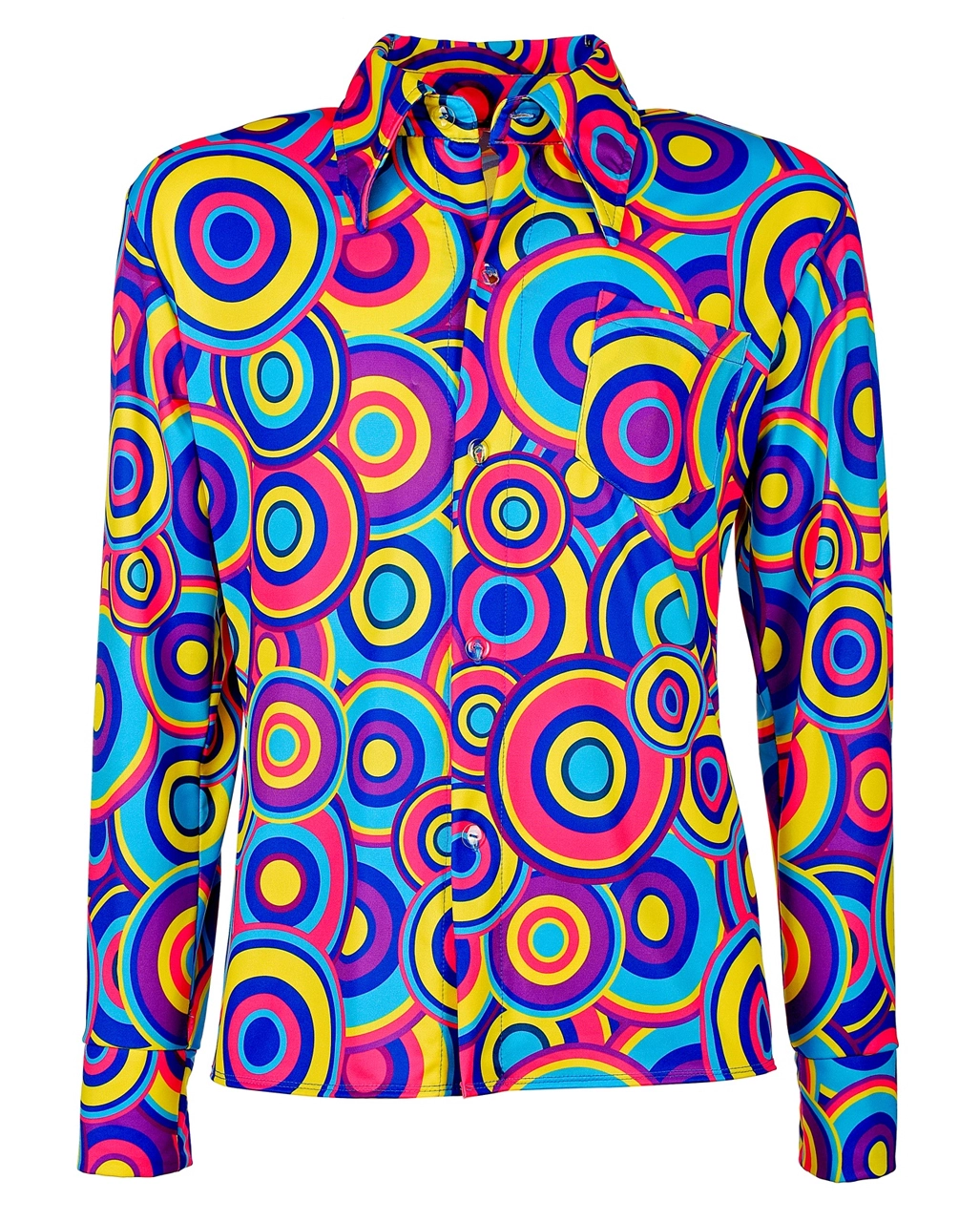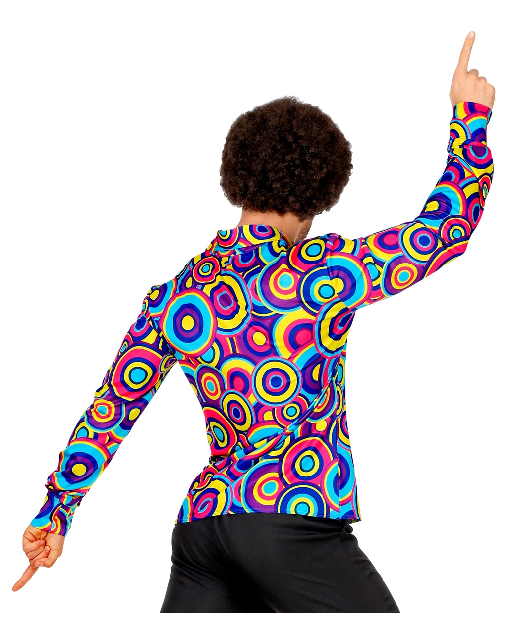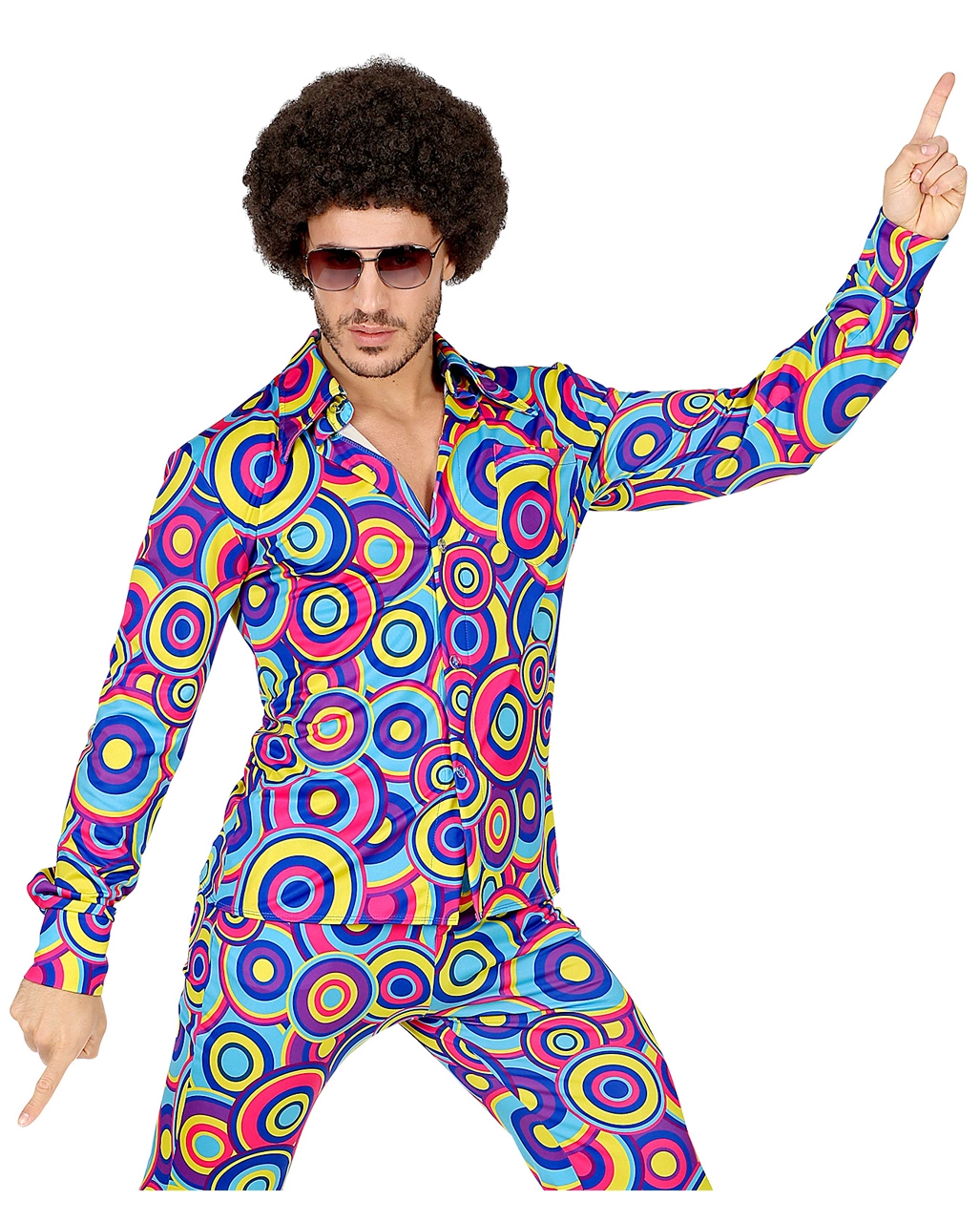 Kein Wunder. Bei dem Outfit. Das 70ies Hemd Bubbles Blau lässt dich wie einen Profi in Sachen Partymachen und Abfeiern aussehen. Die herrlich bunten Kreise in den Farben Blau, Hellblau, Gelb und Violett krönen den Disco King des Abends. Passend zu deinem genialen 70s Kostüm Hemd kannst duch auch noch mit der Braune Afro Perücke und der Orange 70er Sonnenbrille für das besondere 70er Jahre Flair sorgen. Eine riesen Auswahl an groovigen Kostüm Accessoires findest du schließlich hier im Shop!