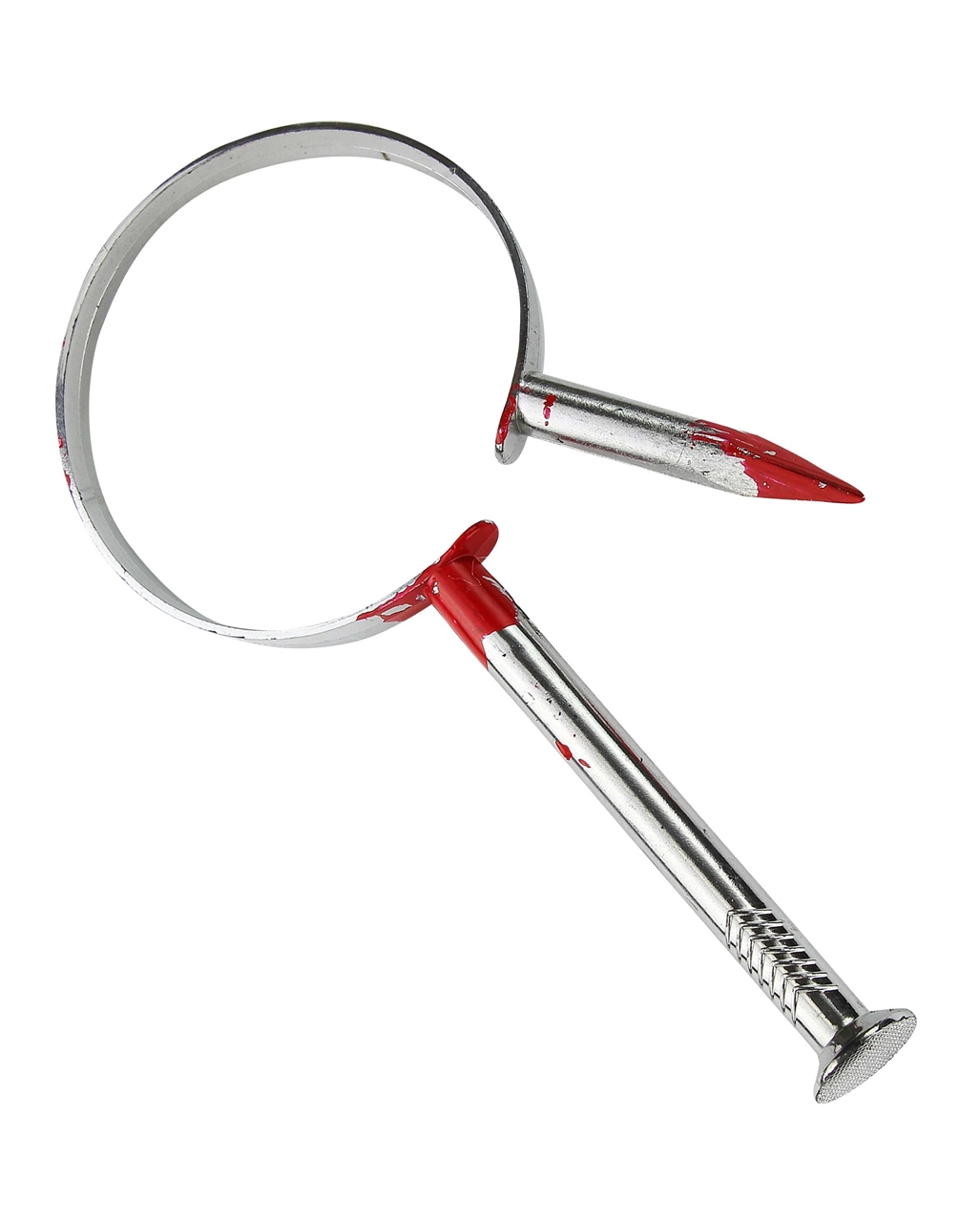 Der blutige Nagel im Kopf Haarreif hat einen etwa 1 cm dicken Nagel als Verzierung, der auf einer Seite ca 5 cm und auf der anderen Seite ca 10 cm aus dem Kopf ragt.