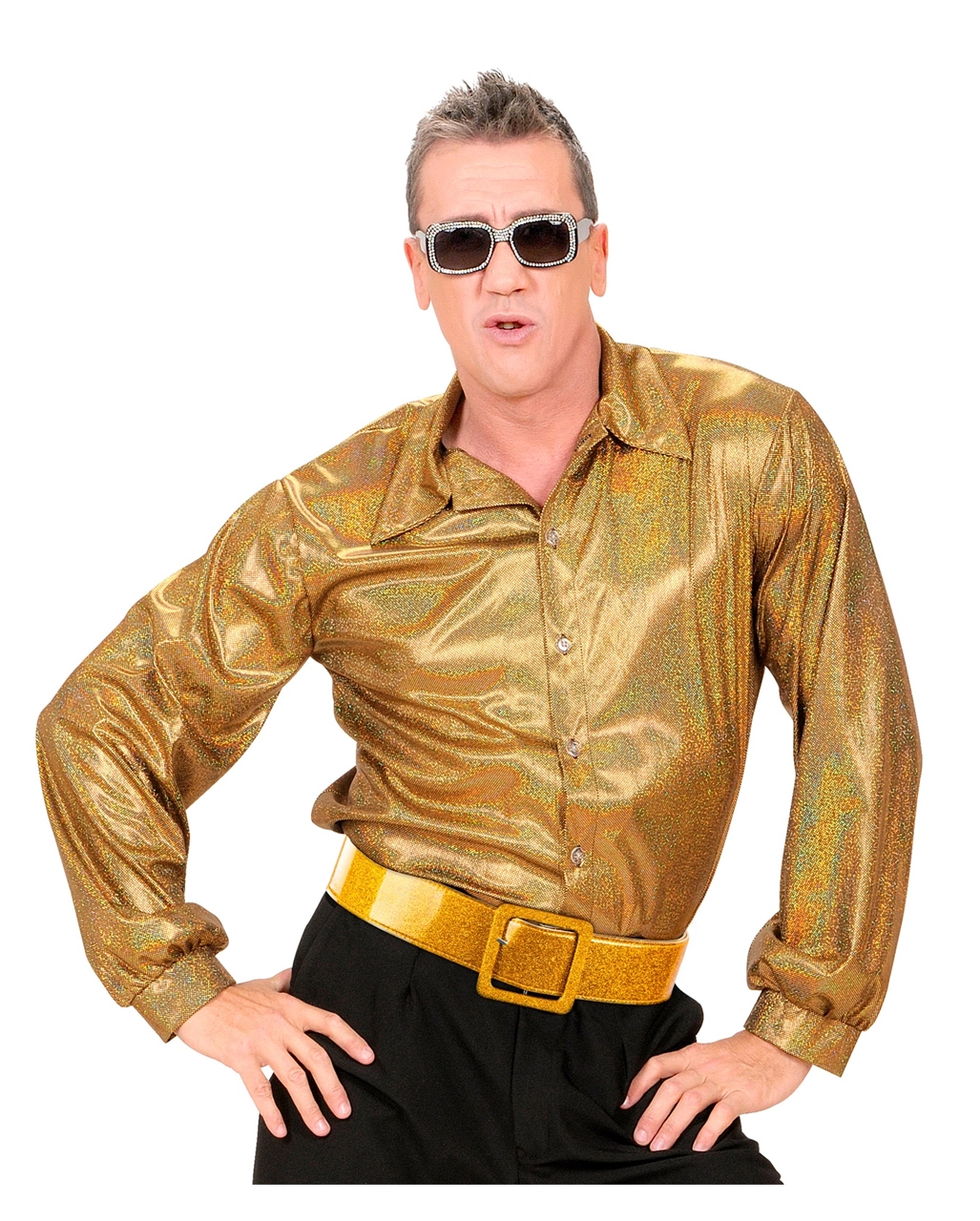 Versetze dich zurück in die verrückte Zeit der Disco Ära oder der Rock`n Roll Zeit und schmücke dein Kostüm mit dem Gold glitzernden Gürtel. Und dazu passend: unser ausgeflipptes Funky Hippie Kostüm Medium! Nun kann die coole Motto Party beginnen!