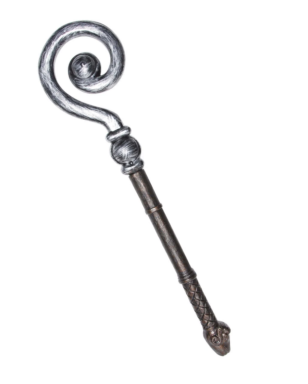 Der an sich schwarze Herrscherstab weist eine Gesamtlänge von ca. 70 cm auf. Das obere Ende des Hirtenstabs ist in silberfarben gehalten und besitzt die typische, gedrehte Optik, wie man sie von gängigen Bischofsstäben kennt. Der dunkle Griff des Fantasy Stabes erinnert optisch an Holz und wird am unteren Ende von einem schön gestalteten Widderkopf abgeschlossen. Mehrere Einkerbungen erzeugen den Eindruck, als wäre der Griff mit Lederbändern umwickelt und sorgen dafür, dass dir Statussymbol auch bei schwitzigen Händen nicht aus den Fingern gleitet.