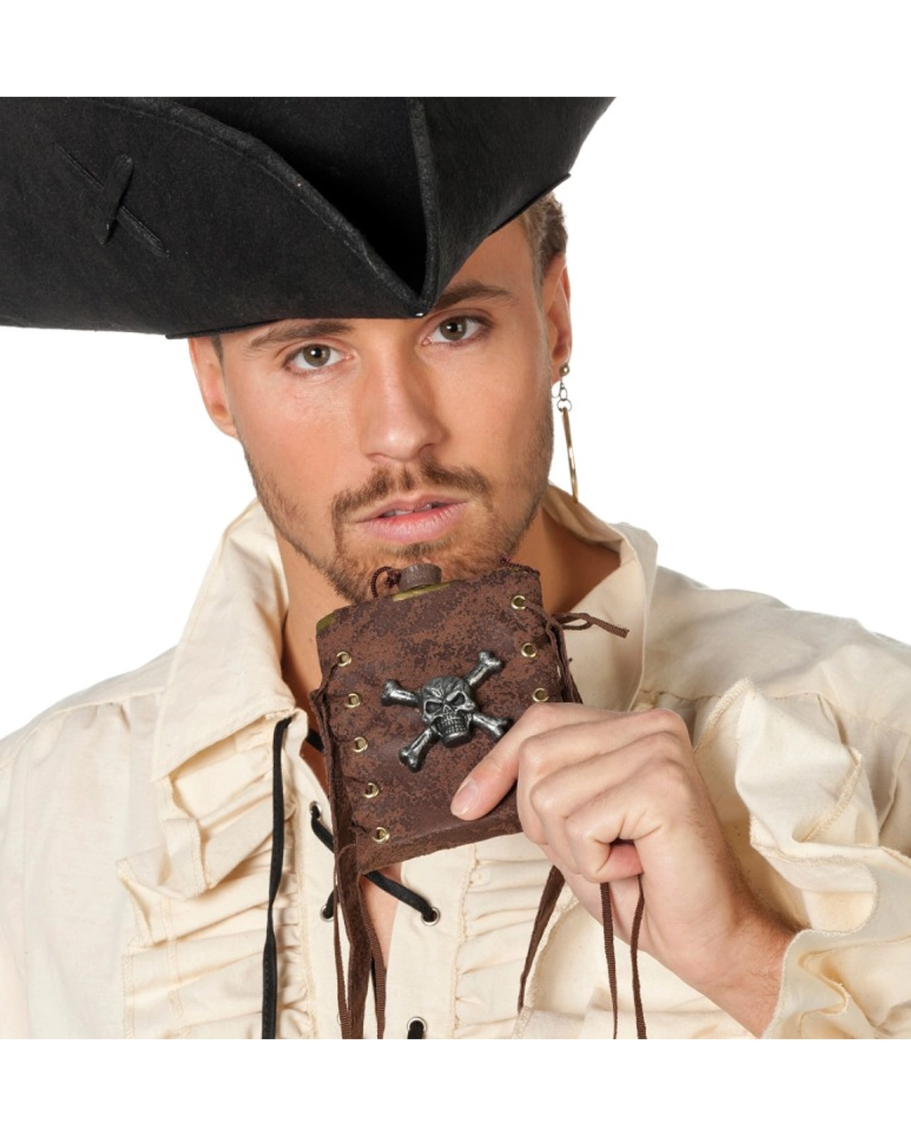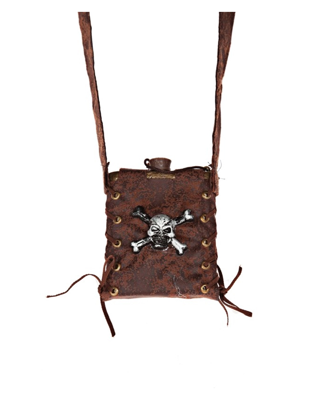 Unsere Piraten Trinkflasche in Metalloptik ist aus Kunststoff, während die Umhängetasche in Wildlederoptik aus Stoff gefertigt ist. Auf der Seiten ist diese zur Zierde mit Bändern geschnürt. Auf der Vorderseite ist als Erkennungszeichen der Piraten, ein Totenkopf mit gekreuzten Knochen in Metalloptik angebracht.