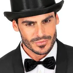 Die schwarze Satinfliege hat eine Größe von 14×6 cm und ist in zwei Schichten gebunden. Dank des verstellbaren Klettverschlusses können die Fliege nicht nur Erwachsene, sondern auch Kinder leicht auf- und abnehmen. Da die Fliege vollkommen schwarz ist, eignet sie sich perfekt als Accessoire für einen schwarzer Herren Frack, und mit einem Gentleman Zylinder ergänzt, kommt unsere Fliege und dein Kostüm perfekt zur Geltung.
