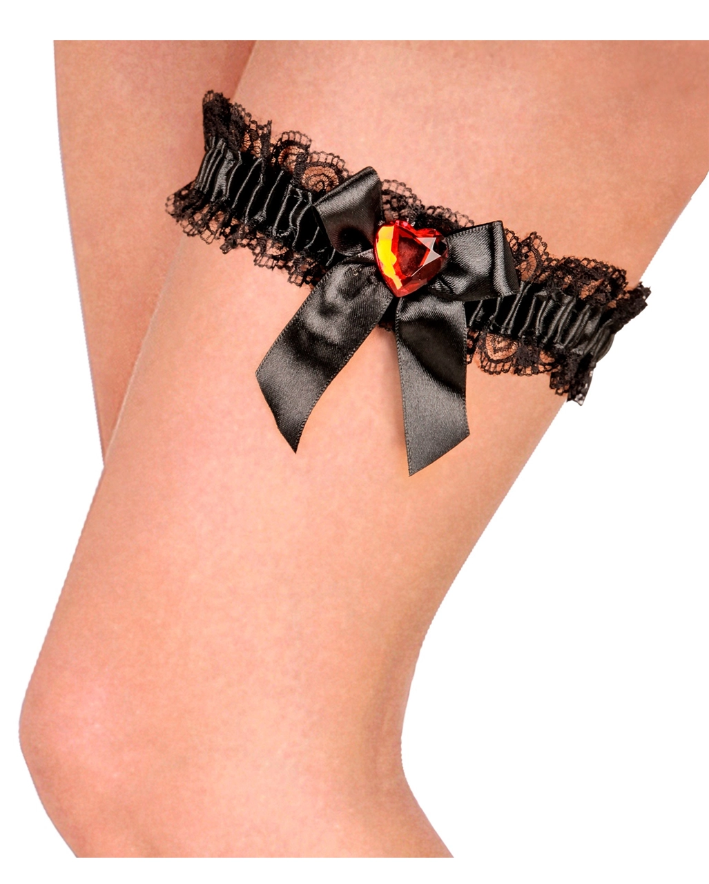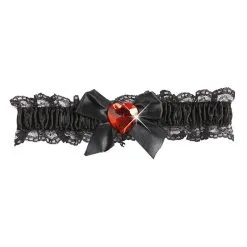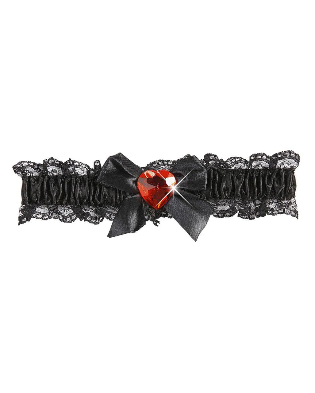 Das Strumpfband mit rotem Schmuckstein besteht aus schwarzer Spitze und hat einen elastischen Gummizug. Auf der Vorderseite ist mittig eine schwarze Satinschleife angebracht, auf der ein rotes Herz als Verzierung funkelt.