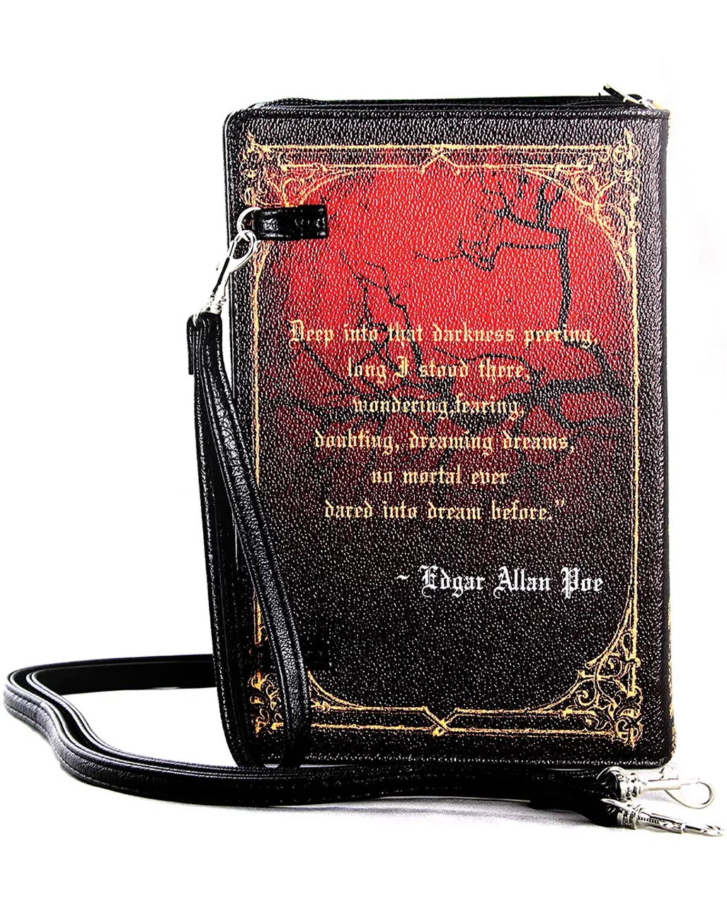 Manche düstere Legenden sind einfach zu schade, als dass man sie nicht permanent mit sich herumtragen möchte. So wie unsere geniale The Raven Buch Handtasche. Die Gothic Schultertasche ist das ideale Mode Accessoire für Fans des legendären Horror Autors Edgar Allen Poe, der vor allem durch seinen “Raben” bekannt wurde. Diese wunderbare Stück Literaturgeschichte diente als Inspiration für die Gothic Handtasche in Buch Form, die durch ihren Vintage Look zu einem schaurigen Gesamtkunstwerk der Mode wird.